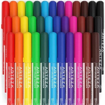 This Dry Erase Markers Set of 36 features 12 bright colors to choose from: red, orange, yellow, green, dark green, bright blue, blue, purple, pink, maroon, brown, and black. Add a rainbow of colors to your fine tip dry erase marker collection with this must-have set of 36. Make writing on whiteboard and glass board surfaces more enjoyable, start by upgrading to this Dry Erase Markers Set today!