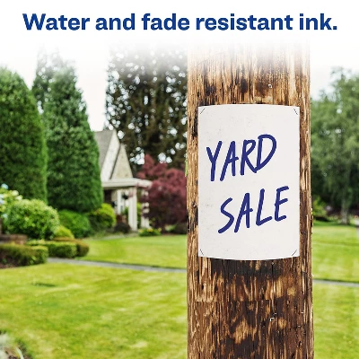 Label boxes, folders or envelopes with these Avery Marks-A-Lot chisel-tip blue permanent markers. Make your mark on the world with Avery Marks-A-Lot permanent markers. These large, thick markers hold over 30% more ink than regular desk-style markers. The resilient chisel tip stays solid even with frequent use and is great for creating various different line widths. The versatile, blue permanent marker ink dries quickly when used but won’t dry out if you forget the cap. Leave the cap off for up to half an hour and you will still be able to pick the marker back up and keep writing. The permanent ink resists wear and water exposure and is perfect for any use. These markers work with multiple surfaces including paper, cardboard, metal, PVC, concrete, plastic and ceramic. Write on sports equipment, make signs for yard sales, mark boxes and more. Marks-A-Lot chisel tip markers are great everywhere from classrooms and offices to warehouses and manufacturing facilities. Avery Marks-A-Lot permanent markers are also low-odor and nontoxic so that they can be safe in classrooms as well as in laboratories. The ink is ACMI certified as nontoxic and conforms to ASTM D4236. Chisel tip markers allow you to create lines in various widths with a resilient tip that won’t fray with use. Write smoothly on practically any surface including paper, cardboard, metal, PVC piping, concrete walls, plastic containers and ceramic tiles. Avery permanent markers won’t become dried out for up to half an hour without a cap. ACMI certified as non-toxic, these permanent markers are also low-odor and conform to ASTM D4236. Wear and water resistant ink sets in quickly and makes these the best markers for writing on boxes, marking sports gear, labeling plastic containers and more. Low-odor ink for your comfort. Sold as 1 Dozen.