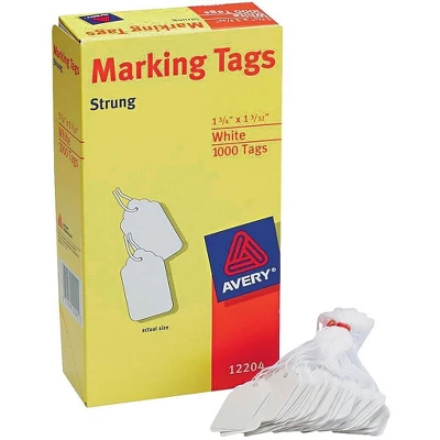 Label items clearly and easily with these Avery 1 3/4 x 1 3/32 white marking tags. Organize products of any size with Avery white marking tags, which feature a smooth yet durable surface. Pre-strung for convenience, these tags quickly affix to almost any product. They are compact and come 1000 to a package, making them ideal for organizing large inventories and shipping departments. Avery white marking tags are simple to use and easy to read, helping you categorize items efficiently. Easy-to-use marking tags for organizing items sale, distribution, storage or other purpose. Tags come prestrung with durable cotton polyester twine. Tag dimensions: 1.09″”W x 1.75″”L. Made of white cardstock. 1000 marking tags per pack. Each tag offers a smooth surface for writing. Knotted string lets you add and remove tag easily without tying knots. Sold as 1000/Box.