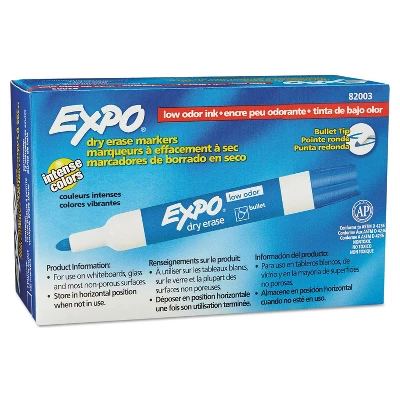 Make both thick and thin lines with this 12-pack of EXPO bullet-tip blue low-odor dry-erase markers. Help key points in your presentation stand out with these EXPO low-odor dry-erase markers. The bullet tip lets you create lines of varied width, while the low-odor ensures a comfortable experience whether used at home, the classroom or the workplace. These EXPO blue low-odor dry-erase markers write well on whiteboards, glass and most other non-porous surfaces and then wipe clean with an eraser or dry cloth. Dry-erase markers for writing and drawing. High-contrast ink in rich blue color that is meant to stand out on all types of materials. Bullet tip writes with uniform and defined lines. One dozen blue markers make sure you don’t run out of them too quickly. As these markers are non-toxic, they are extremely safe to use. Meets or exceeds ASTM D4236 and ACMI AP standards. Low-odor ink for your comfort. Safety Data Sheet. Sold as 1 Dozen.