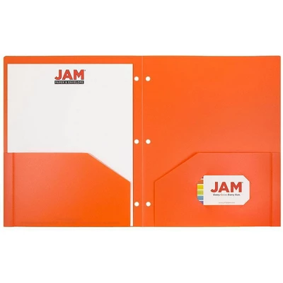 JAM Paper Heavy Duty 3 Hole Punch Folders are made out of smooth, durable plastic and measure 9 x 12 inches in size. Strong and durable, you will never have to worry about losing any important papers! See the difference these folders can make at work or home! This pack contains a total of 6 folders. Each one features three holes in order to securely put into 3 rings binders and has two pockets on the inside.