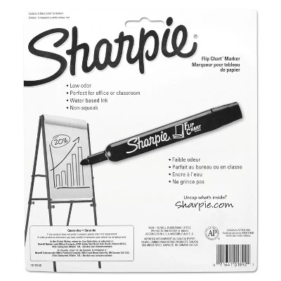 Create easily legible diagrams and text using these Sharpie flip chart markers in black. Conduct large brainstorming sessions with high visibility by using these low-odor markers featuring bullet tips for reduced squeaking. The water-based ink in these markers stays on one side of the page, reducing bleeds and keeping each new page fresh. This eight-pack of black Sharpie flip chart markers is ideal for stocking conference rooms, classrooms, or other shared work spaces. Permanent markers for writing and drawing. Create clear black lines with these markers, which are well-suited for a variety of office tasks. Bullet tip writes with uniform and defined lines. Eight markers per pack. Meets or exceeds ACMI AP standard. Sold as 8/Pack.
