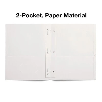 Carry papers around with you using this 25-pack of Staples school-grade white two pocket folders with fasteners. Stay on top of important assignments with these Staples two pocket folders. Each one is made from economy-weight white paper and offers two storage pockets, each with a 25-sheet capacity, letting you easily carry a variety of items as well as a business card. These Staples two pocket folders include fasteners, making them ideal for keeping track of important documents and forms. School folders are made from economy white paper stock. Features two pockets to store papers, brochures, and more. Holds standard letter-size paper. 25 folders per box is enough for almost any project. A business card holder adds an extra professional touch to each folder. 135-sheet capacity allows for convenient organization of loose papers. School-grade folder is great for meetings as well as classrooms. Sold as 25/Box.