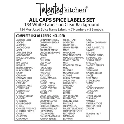 Organize your kitchen drawers, cabinets, and pantry shelves with this set of 134 water-resistant vinyl spice bottle labels. This custom labels for spice jars kit has 7 sheets of 134 herb labels altogether. This set includes 124 preprinted spice labels stickers, 7 number decals, and 3 ampersand (“&”) stickers. The 0.5-inch tall all-caps white text is set against a transparent background; the spice labels vary in length and fit round or square containers. Our seasoning stickers feature the most commonly used spices and herbs, including cayenne, chili powder, turmeric, pepper flakes, rosemary, black pepper, coriander, curry, seasoned salt, lemon pepper, nutmeg, salt, onion powder, cardamon, garlic powder, basil, thyme, ginger, oregano, and smoked paprika. The numbered labels and ampersands allow you to create a kitchen storage solution that fits your needs down to the last jar. You will also receive an alphabetized list of the label names for easy reference. NOTE: Spice jars are not included. Talented Kitchenâ„¢ is a trademark or registered trademark of Juvo Plus, Inc. All other marks shown are owned by their respective owners.