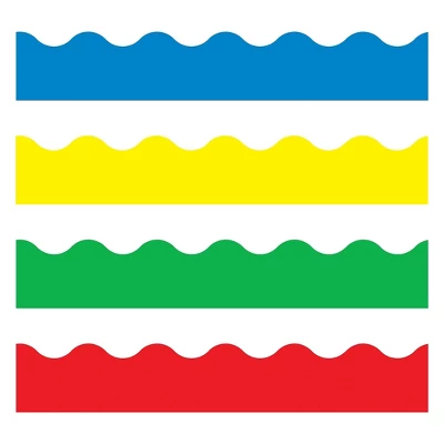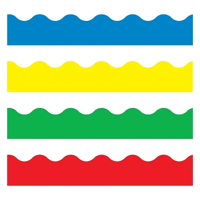 The TREND T-9001 Bright Colors Scalloped Terrific Trimmers come in a variety pack, which includes 4 shades enhance bulletin boards and other wall displays. Brighten up the classrooms of prekindergarten to grade 12 kids with the TREND Bright Colors Trimmers. The pack includes solid red, blue, yellow and green trimmers, which offer variety and lend a vibrant look to any artwork. Additionally, they have scalloped edges that further add style to the displays. From framing bulletin boards and windows to making personalized bookmarks, these border trims give you multiple decoration options. Classroom trimmers are apt for giving projects a complete look. 156′ long trimmers can be layered on solids, sparkles and metallic surfaces for creativity. Scalloped trimmers sport solid shades to make displays prominent. Durable in make, they can be used for multiple projects. 156′ of Trimmer in blue, green, yellow and red. Classic borders match solid color Ready Letters!. Sold as 48/Set.