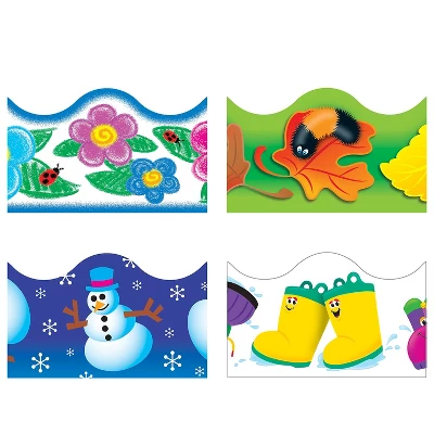Trend classroom decor vibrant colors and designs draw attention to your messages and materials anywhere people gather!. Irresistible designs at your fingertips! Spruce up your spaces and rev up the fun with a convenient Variety Pack of Terrific Trimmers. Vibrant, contemporary designs create cheerful, inspiring classrooms, add pizzazz to parties and events, inspire clever hats ‘n crowns, and dress up storage containers, cubbies, and shelves. Layer patterns on solids, sparkles, or metallics for extra WOW! Durable and reusable. Includes Fall Fun, Rainy Day Boots, Crayon Flowers, and Winter Fun Terrific Trimmers. 156′. Durable bulletin board trims for toddler to 9th grade can be reused for several decorations. 156’. Four Seasons. Recommended for all ages. Pack Qty: 48. Ideal for prekindergarten to ninth-grade (ages 3 to 15). Sold as 48/ST.